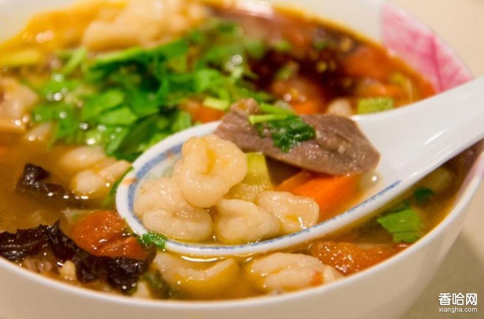 8)將煮好的麻食以及黃豆,炒好的配菜倒入湯中,大勺一攪,盛入碗中,滴幾滴辣椒油。