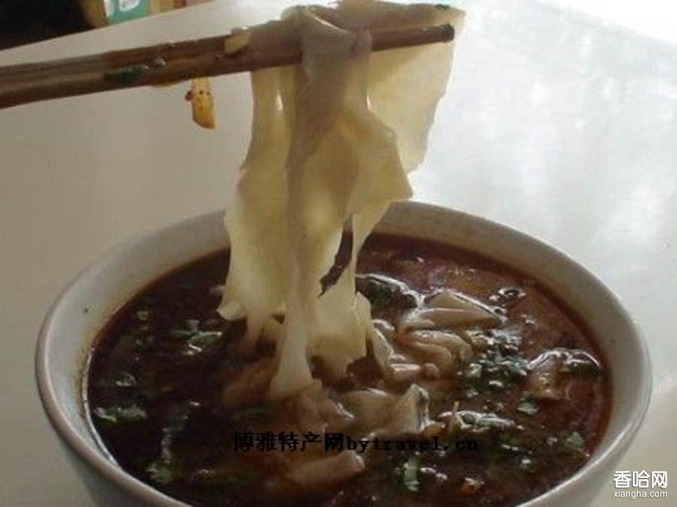 5.取爐齒面煮熟,分別裝碗,調(diào)入精鹽、醋、醬油少許,再澆上“湯臊子”,撒上“花臊子”,最后淋入辣椒油、蔥花油即成。