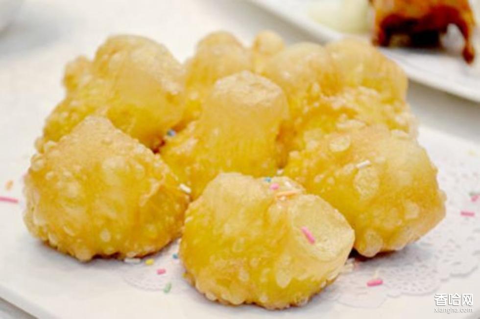 4、經(jīng)炸后,糕面出現(xiàn)薄如蟬翼、白如霜雪的一層泡,猶如繁花盛開(kāi),似乎見(jiàn)風(fēng)即消,入口即化,松軟綿潤(rùn),芬芳醇香。