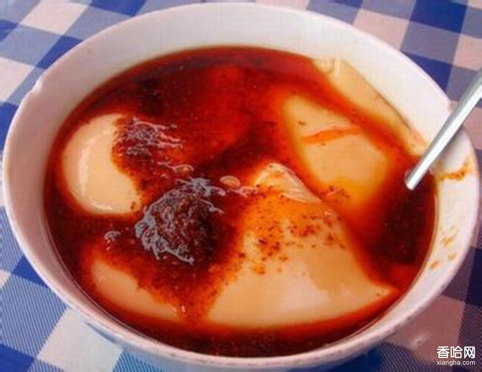 制成后顏色雪白,柔嫩光潔,翻而不散,攪而不斷。食用時(shí),用勺舀起盛入碗內(nèi),澆上適量的調(diào)和湯,再撒上黃豆、香菜、榨菜末、辣椒油等佐料,紅白相間,風(fēng)味特異,吃起來(lái)咸辣清香,爽滑利口,香味撲鼻。