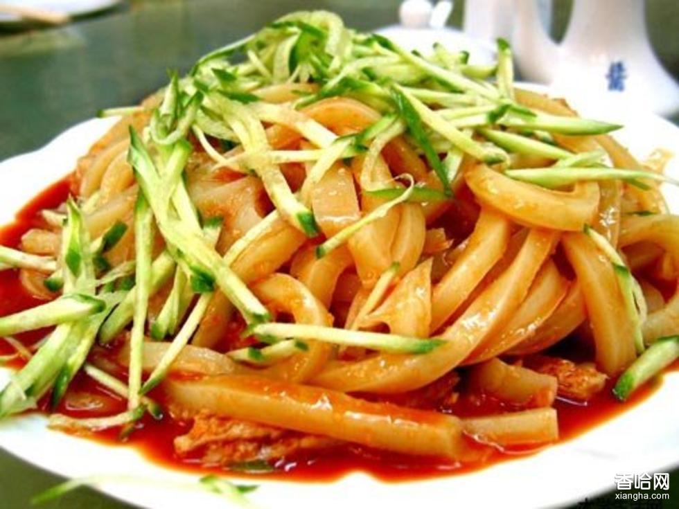 師傅當(dāng)著顧客的面,用一把幾十斤重的大刀把整張的米皮切成細(xì)條,拌上特制的辣椒油、醋和鹽,加上芹菜丁和豆芽、黃瓜絲等小菜,一碗碗看來(lái)紅通通、吃來(lái)“筋、薄、細(xì)、軟”、涼爽可口的秦鎮(zhèn)米皮就可以上桌食用了。