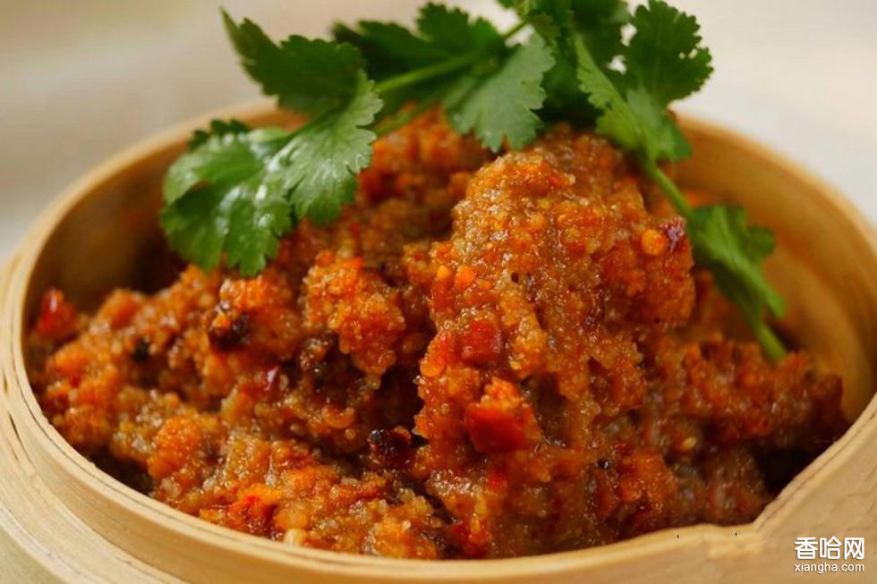 制作過程: 將羊肉在水中浸泡2小時(shí),清洗干凈后切成長5厘米、寬3厘米的長方塊;蔥和香菜洗凈后切末。羊肉與蔥、菜、味料同拌,邊拌邊摻蒸肉粉,直至攪拌均勻。荷葉在水中浸泡半小時(shí)后,將一張荷葉切成兩半,把拌好的羊肉放在荷葉上卷成春卷狀,入蒸籠蒸2小時(shí)后,再排入整張荷葉中即可。