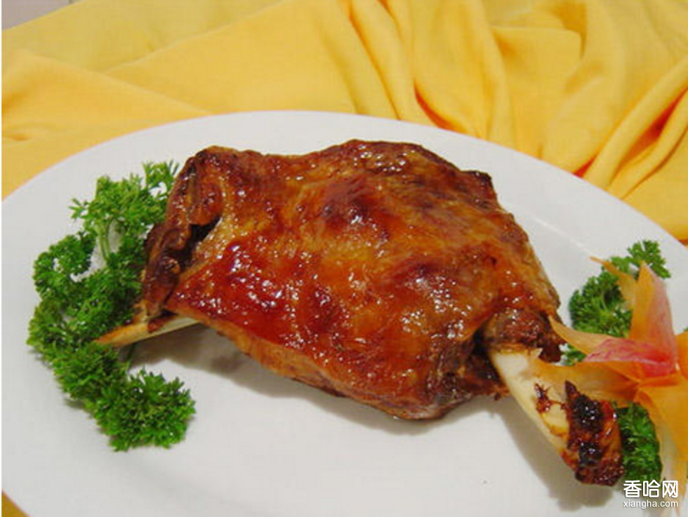 制作步驟:1.將羊腿沖洗干凈,用鐵釬子均勻地遍戳小孔,置容器里,加精鹽、花椒水腌4~6 小時(shí)。2.烤盤內(nèi)加桂皮、八角、草果、姜、番茄醬和羊湯,再放入腌過的羊腿,在羊腿上放蔥頭、番茄、芹菜。待烤箱升溫至180~200℃左右,將烤盤推進(jìn)烤箱內(nèi),每小時(shí)翻動一次,約3~4 小時(shí),湯汁烤干,羊腿爛熟,取出裝盤,以香菜點(diǎn)綴即成。
