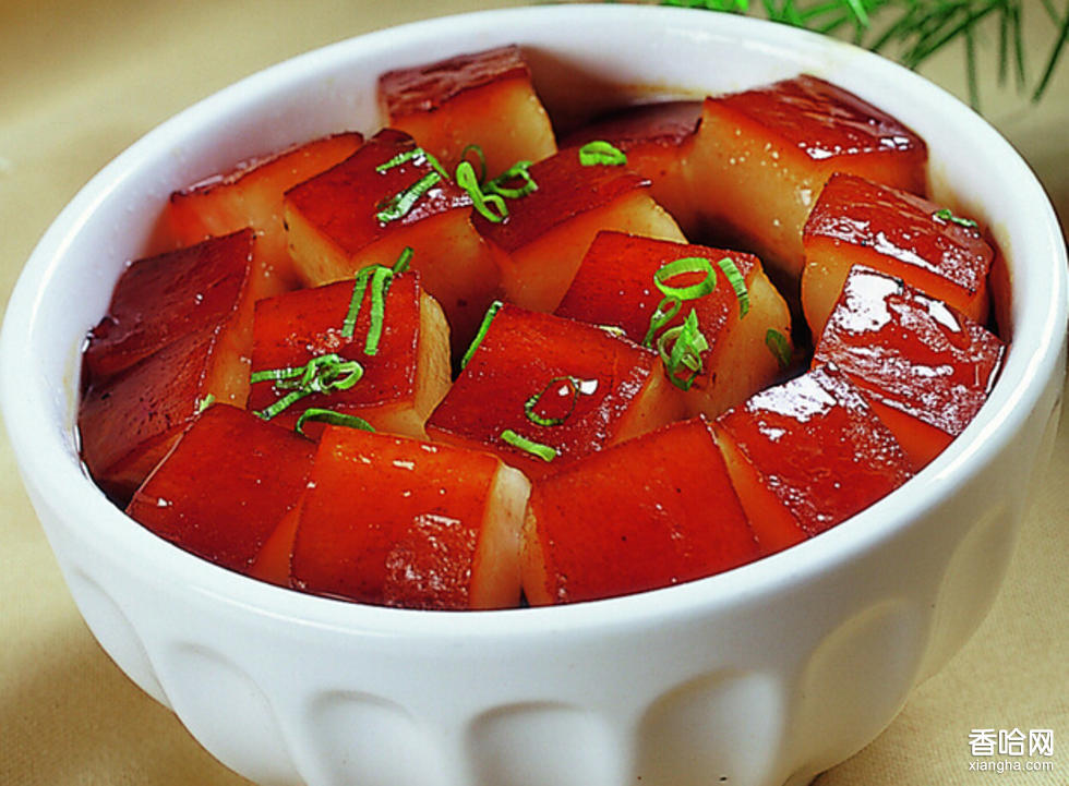 選用上等五花肉切成大塊,入清水中煮至七成熟,起鍋上色,入油鍋中炸至金黃,放入調好的豉油汁中煮2小時,起鍋改刀成型入蒸箱中蒸4小時即可出籠,用原汁勾芡澆在五花肉上,用青白菜汆水后圍邊。整體色澤紅亮、咸甜適中,肉肥不爛,肥而不膩,老少皆宜,風味獨特。