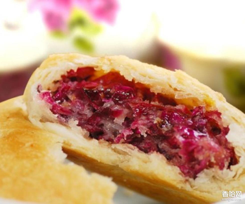 【制餅】:鮮花餅的大致做法是——用含苞欲放或者微微開放的玫瑰花的花瓣制作成玫瑰花餡,加之以面粉、香油、白糖、蜂蜜等配料焙烤而制成,新鮮出爐的鮮花餅酥軟爽口、花香濃郁、沁人心脾。