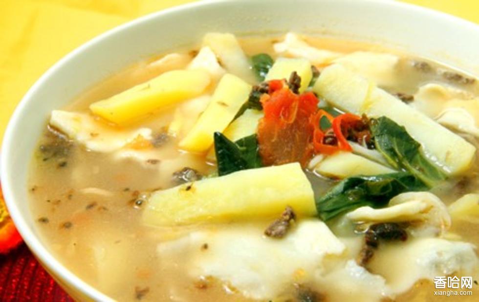 (4)將備好的面取一條在案板上壓成扁長形,然后慢慢地抻,抻得長長的繞在左手腕上,用左手拇指和食指掐住一端,用右手一小塊一小塊地拉斷投往肉湯鍋里,不一會兒香熱的面片就起鍋了,加入調(diào)料即食。CdW