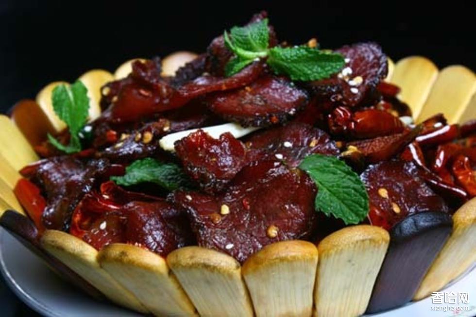 牛干巴是回族最主要的閹制肉制品,其味道獨(dú)特、營(yíng)養(yǎng)豐富,為各族群眾所喜愛(ài)。隨著人們生活水平的不斷提高,牛干巴這昔日的“富貴菜”也早已“飛入尋常百姓家”,成為頗有特色的風(fēng)味食品。牛干巴的制作工藝簡(jiǎn)單,取肥壯的牛肉(以黃牛為主)根據(jù)人們的口味配鹽、花椒、胡椒、八角、草果(這四種配料均應(yīng)打成粉末狀),用手揉搓待鹽味調(diào)料入肉后,密封15至20天,然后取出經(jīng)涼曬而成。制作牛干巴的時(shí)節(jié)主要為冬季。牛干巴可以煎炒或蒸食,也可加入蓮花菜等蔬菜炒,一般不需要再添加鹽或其他調(diào)料。由于牛干巴是閹制品,沒(méi)有經(jīng)驗(yàn)的人很難憑肉眼識(shí)別好壞、真假。因此建議人們?cè)谫?gòu)買(mǎi)時(shí)一定要選擇清真風(fēng)味即由回族加工生產(chǎn)的,因?yàn)榛刈迨秤玫呐H獗仨毷怯砂①暝讱⒒钆6鴣?lái),回族忌食用未經(jīng)阿訇宰殺的牲畜。這就從根本上保證牛干巴原材料無(wú)問(wèn)題。且回族制作牛干巴的工藝比較傳統(tǒng),除上述的花椒等幾種調(diào)料外,不會(huì)再添加其他化學(xué)原料
