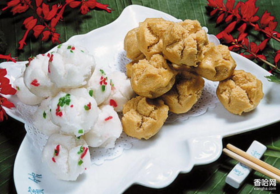 碗耳糕又名“娃兒糕”,貴州貴陽地區(qū)漢族特色糕點(diǎn)。形狀像一個(gè)小茶碗,因用“碗耳糖”制作,小孩特別愛食,故名。碗耳糕已有一百多年的歷史,是貴陽的傳統(tǒng)著名風(fēng)味小吃,它呈金黃色(也有白色),有彈性、個(gè)大、綿、香、甜、略帶甜酒的發(fā)酵味,非??煽凇V谱鞣椒ㄊ菍?u data-RIUP="W3nIgC">大米浸泡、淘洗、磨成漿、過濾,然后發(fā)酵,摻些熟芡,紅塘液化過濾,摻在打好的米漿里,加堿拌勻蒸成熟糕即成。貴陽做的碗耳糕的飯店很多,以四季春餐館為最,深受人們歡迎。