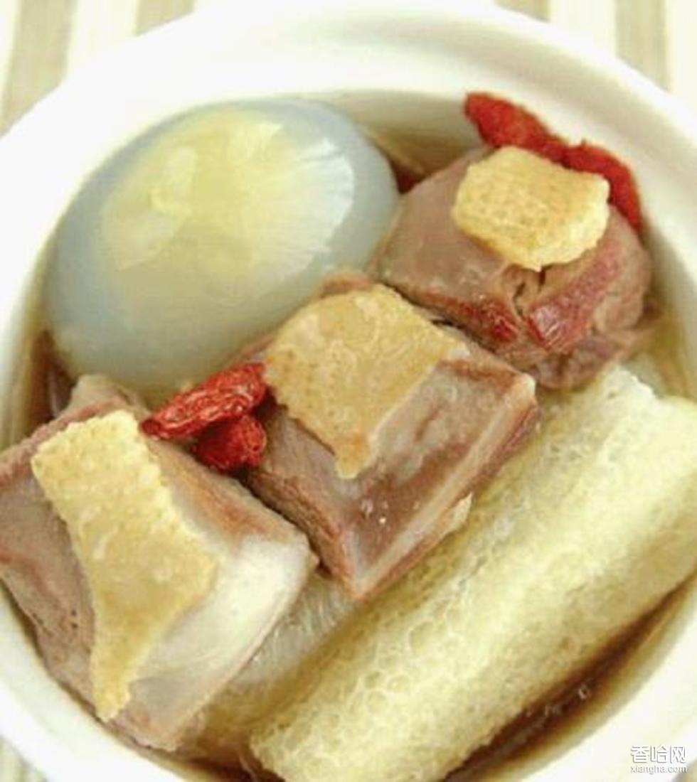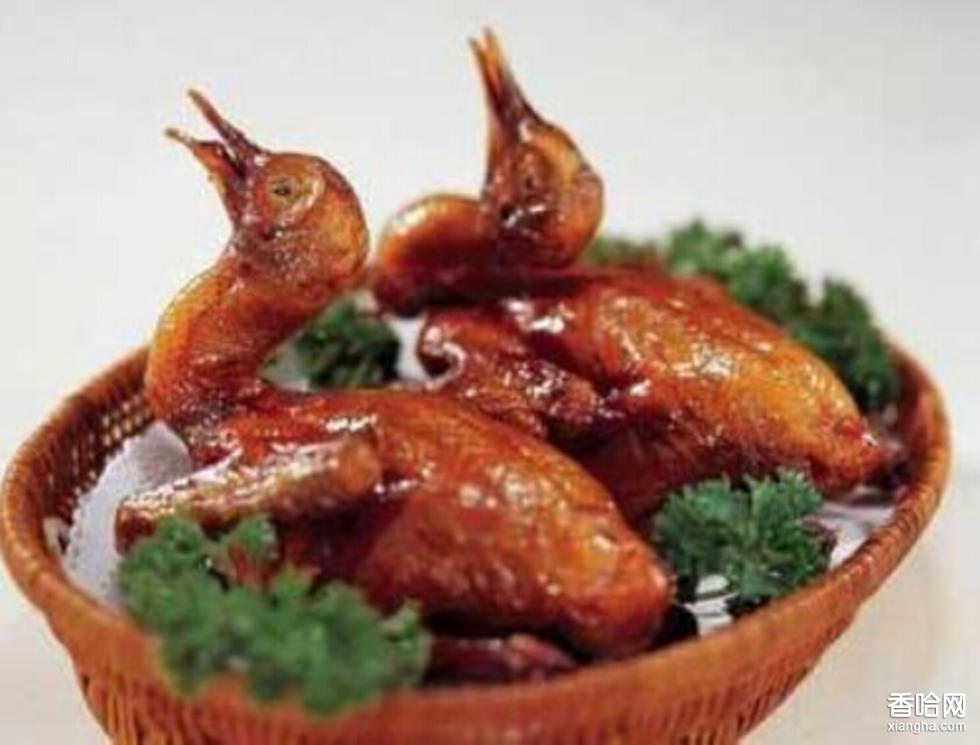 天麻鴛鴦鴿是一道漢族藥膳。此菜是以天麻和鴿子為主料,將天麻切成小顆與凈鴿蒸制以后加入雞絨丸子、嫩豌豆苗和調(diào)料而成的一道菜的名稱,因猶如鴛鴦戲水而故名,具有湯質(zhì)清澈,色澤淡雅,肉質(zhì)鮮嫩、爽口的特點(diǎn)。將天麻入碗,加少許清水上籠蒸熟后切成碎末。雞脯肉捶成茸,肥膘肉切成末,用蒸天麻的汁水,姜汁水?dāng)嚿?,加入天麻末、雞蛋清、精鹽3克、味精1克、胡椒粉1克、濕淀粉攪成餡。將鴿宰殺治凈,背開取內(nèi)臟,焯水后入湯缽,加雞湯、鹽、蔥結(jié)、姜塊、上籠蒸爛,加味精、胡椒粉。另用一湯缽放入豌豆尖,放入鴿子,潷入原湯。炒鍋置小火上,下清水燒沸,將肉餡擠成丸子入鍋氽熟,撈出擺在鴿子周圍即成。