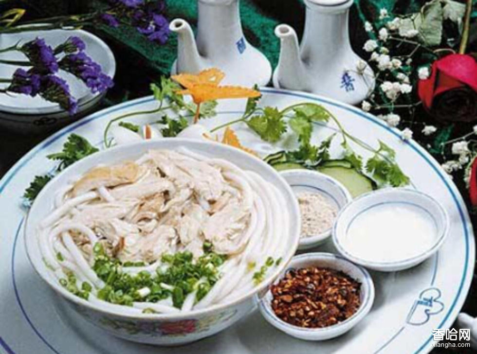 片雞粉是貴州貴陽市的漢族傳統(tǒng)名小吃,爽滑微韌,鮮香不膩,獲首屆“中華名小吃”稱號。雞宰殺治凈,漂去血水后放入湯鍋內(nèi),加姜片、蔥節(jié)大火燒開,改小火煮30分鐘至熟,取出將雞肉片下,雞湯留用。取雞湯150克加鹽、雞精、化豬油調(diào)味備用。米粉放入沸水中小火燙至米粉漂起,取出放入碗中,加上燒熱的雞湯、將切好的雞片30克放在米粉上,撒糊辣椒面、胡椒粉、蔥花即可。