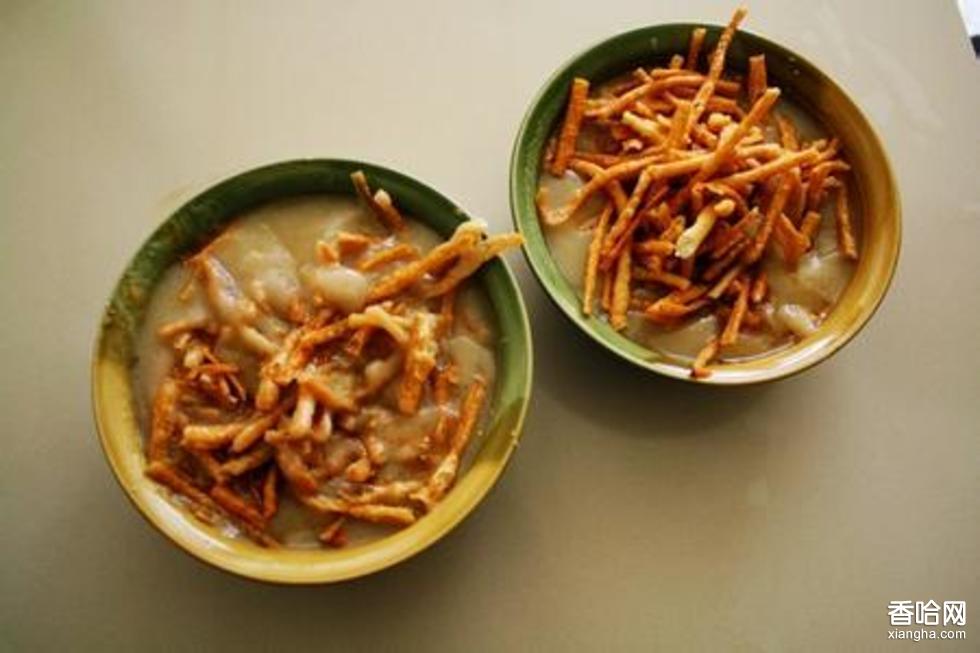 其做法是:先將白米打碎為細(xì)粉,放入鍋中加清水?dāng)嚦上{糊狀,然后加熱,文火慢煮,待米糊煮熟粘勺子時(shí),加入少許糖汁水,使之變?yōu)樯铧S色,便可起鍋入碗。