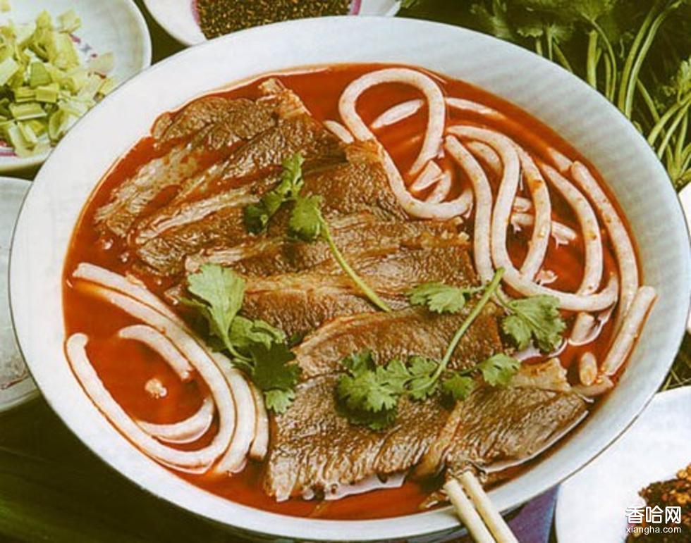 材料:南充鮮米粉1500克,帶骨羊肉1000克,豬骨、川鹽、生姜片、胡椒粒、花椒、味精、胡椒粉、紅油、凈香菜粒、熟豬油、芝麻油各適量。