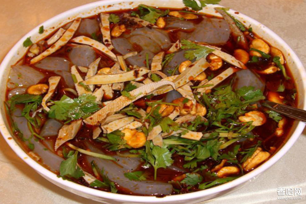 吃川北涼粉時(shí),將涼粉切成薄片,或用旋于族成筷子粗細(xì)的條絲,裝人碗里,再加上精鹽、味精、蒜水、花椒面,再淋上色彩鮮紅的辣椒油,撒上少許蔥花,即可食用。特點(diǎn):細(xì)嫩綿軟,鮮美滑爽,香辣利口。還可用“黃粉”制成黃色涼粉,用綠豆制成綠色涼粉,既可單獨(dú)食用,還可裝入鍋魁或“薄餅”(精白面攤成如紙樣厚薄的餅)套食。還有一種熱涼粉,其制法也用豌豆粉攪拌成糊,不同者,熱涼粉是在瓦盆里加熱摻水加豆粉攪成糊狀,然后加入佐料,吃起來(lái)熱乎乎的,又是一番風(fēng)味。