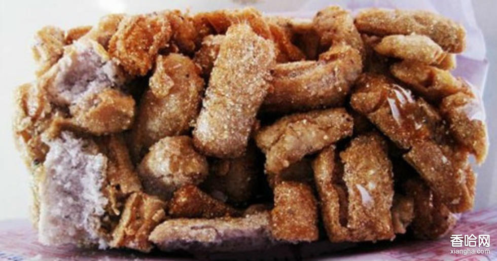 4.油炸:先將麻油倒入鍋內(nèi),升溫到250~280℃時(shí),再將生坯逐漸放入油鍋,待生坯呈谷黃色、爆化時(shí)即撈出,是為糕坯,冷卻待用。