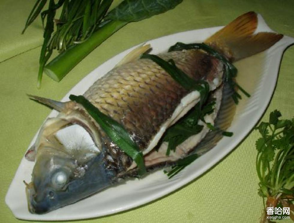 烹制“魚包韭菜”是選用鮮活的1—2斤重的鯉魚或草魚,去鱗、去鰓后,沿背部剖開,但腹部相連,除去內(nèi)雜后清洗干凈,酒上醇香的九阡酒,拌上葷蔥、大蒜、生姜、糟辣,加上少量食鹽,然后再將洗凈的寬葉韭菜、廣菜充填在魚腹內(nèi),將兩半魚合攏,用糯米稻草扎牢,放入大鍋內(nèi)清燉或大甑子中清蒸,約幾個小時后取出即成。