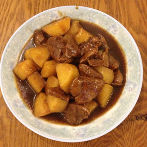 原材料:五花肉250克、土豆250克、醬油2湯匙、糖2湯匙、蔥適、姜適量、紹酒1湯匙