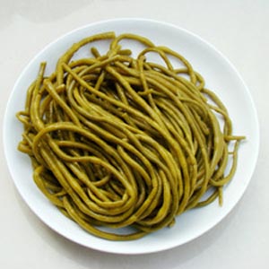 2、鍋內(nèi)放入適量的水燒開(kāi),加入少許油,下入豇豆煮熟,撈出瀝干待用;