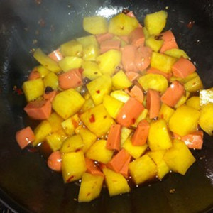 4、土豆丁炒熟之后,放入火腿腸丁,一起炒制,放入適量的鹽、味精,就可以出鍋了。