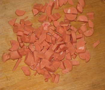 2、將火腿腸切成指甲蓋大小的丁,然后放入盤子中備用。