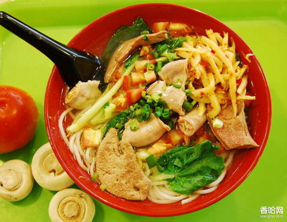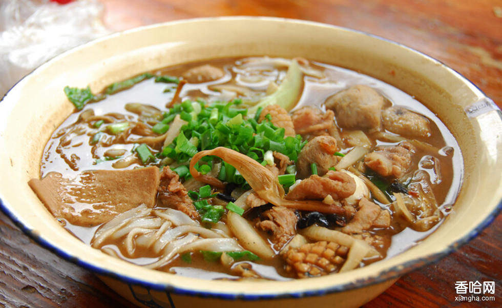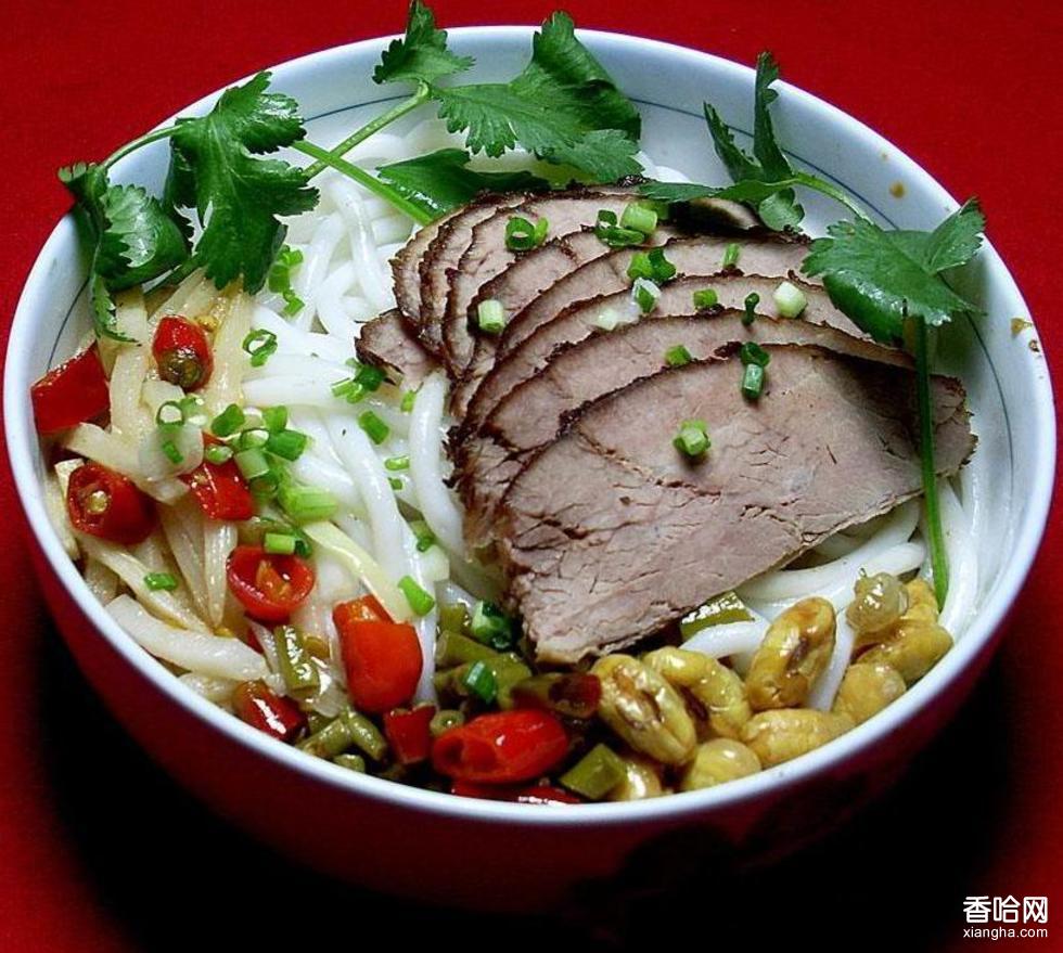 1、冒熱米粉:把燙熱的米粉濾干,再配以鍋燒豬牛肉片,鹵牛膀、牛肝等,加鹵水、花生油、酥黃豆或辣椒、蒜蓉,攪拌入味。這種米粉吃起來拂拂作響,聲色味俱全。