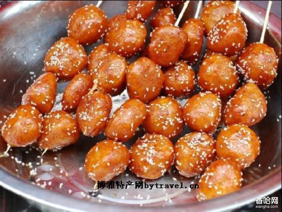 糖油果子以糯米、紅糖和芝麻為原料,將糯米粉團(tuán)在油中炸制后裹上白芝麻并用竹簽穿起來。一串有四五顆左右,每串約一兩元錢。每一顆糖油果子渾圓光亮,呈棕紅色,有焦糖香味,表面有噴香的白芝麻,咬下去皮脆內(nèi)軟,更有炸的好的果子里面是空心的。微帶酸味的粘軟糯米和焦脆香甜的外皮和著白芝麻嚼在嘴里,越吃越有味道。3N6
