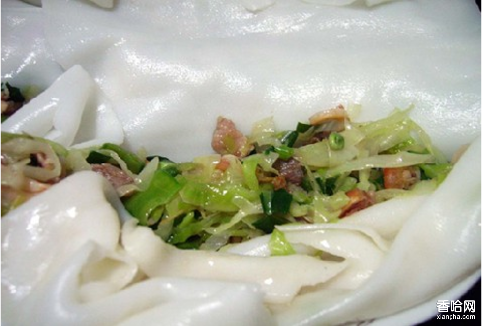 2.然后是蒸腸粉。腸粉蒸好后,對稱切開成兩個長方形,寬度約為二十厘米,將油條放在切開的3.一邊腸粉中,用腸粉包卷油條。