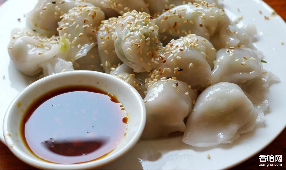 東陂水角的制作過程相當講究。須預先訂制一口“鼎”樣的大鍋,底斜平、直身,比大飯鼎還闊大,而直身高度稍矮。砌置灶上,灶面要寬,以便易于操作。先制作水角糍皮,將預先選好的上乘:—等油粘米(粳米8至10斤)洗凈浸透,磨漿,米漿愈細愈好。然后大鍋灶下干柴燒火,用熟油煎鍋兩次,把米漿倒進鍋內加溫,等米漿稍熱,使用一條頭粗尾細的硬木檑杵圓周搗拌,鍋下繼續(xù)燒火,米漿越搗拌越稠,也越費力,最后,稠糍粘在檑杵上,往鍋里再放少許豬油,繼續(xù)搗圓周,于是米糍已成半熟;全部粘在檑杵上,便可取出置于臺板上,加些小米粉,分開小團揉搓均勻,用濕巾蓋住,以免干裂。用時再掰成拇指大小的糍,用圓木面杖來回搟碾,使之成碗口大小的圓片,這就是包餡的糍皮。做餡的料是精肉、馬蹄,蔥白。先把精肉配以白糖、醬油,生粉、茶油、姜汁腌好;馬蹄去皮拍碎剁爛:蔥白切成米粒大小,三料和在一起均勻混合,整水角放餡時,每一只水角放進一粒白胡椒。然后,用手工把糍皮包裹肉餡,水角樣子既像北方的餃子,也像南方的蝦狗,這就是水角。一個個水角放在小圓篩上,裝滿一篩,放進水鍋里蒸20分鐘,取出,將篩用圓板蓋住,反轉過來,去篩,用薄片迭進盤碟,面上涂遍香熟油、麻油,播撒一層炒香的白芝麻,放上兩根翠綠的香絲芫荽,色香味俱全。