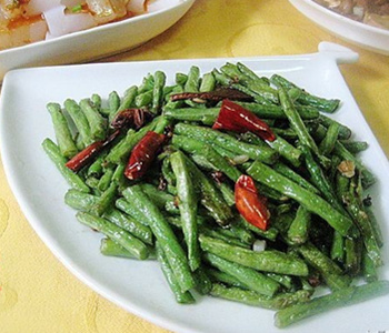干煸豇豆是四川一帶的家常菜,干煸豇豆的做法就是將豆角稍微干煸一下,使其干身爽脆,再用干辣椒和花椒拌炒入味而成。