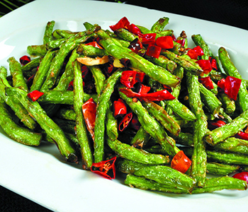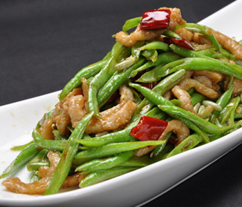 干煸是川菜的一種烹調(diào)技法,而干煸豇豆即將豆類蔬菜切段,投入加少許油的鍋中煸炒,炒至豆類水分散發(fā),干香油亮,脆嫩爽口即成。