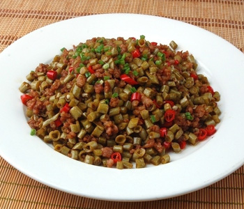 4、再加適量油燒熱,下酸豆角粒炒香,將牛肉末回鍋一起快速兜勻,加適量鹽、生抽、雞精、糖調味,勾薄芡,淋麻油,裝碟上桌即可。