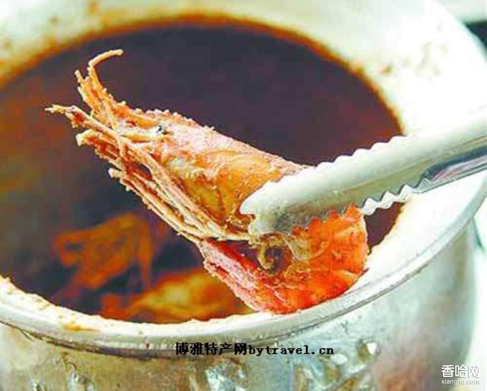 秘制瀨尿蝦是珠海的一道名吃。該菜制作講究,先把瀨尿蝦背上的硬殼剪掉,在中間開一刀,釀入酒店秘制的咸淡水蝦膠,再上一層炸粉絲,待油燒開,放入已釀好的瀨尿蝦炸至金黃即可。上菜時(shí)配以一個(gè)用面類做好的網(wǎng)及一樽捕魚翁雕塑,使該菜更具文化特色。