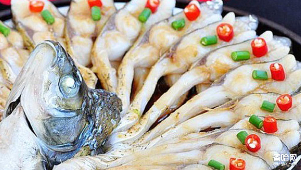 2.從刀口處相間放上火腿片、筍片、香菇片、蝦仁,再在魚身上放點(diǎn)蔥段、姜片、豬板油丁、料酒,用大火蒸15分鐘,取出去掉蔥段、姜片,淋香油上桌即成。