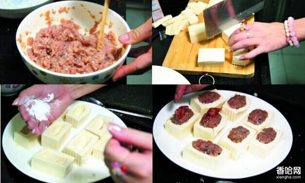2、給豆腐塊挖洞要小心,別挖穿底部,釀入魚滑不宜過多,否則會(huì)將豆腐撐裂。