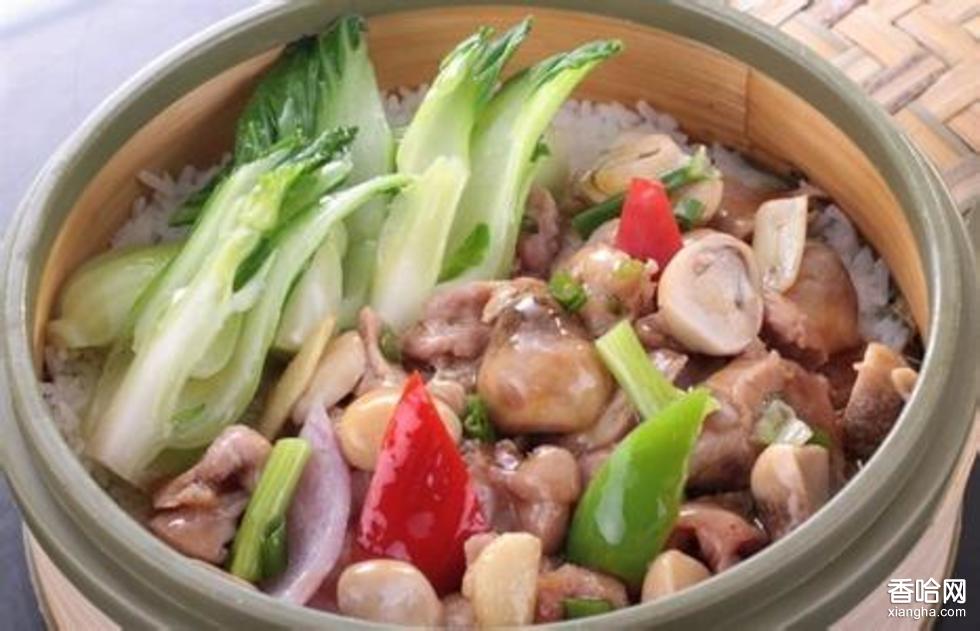 籠仔飯吃起來(lái)香,做來(lái)也復(fù)雜,籠統(tǒng)說(shuō)是要把飯先炒后蒸。以最受歡迎的香菇云耳滑雞籠仔飯來(lái)說(shuō),先將荷葉飛水,瀝干后放上芫荽、紅椒和蔥段,將雞切件抹干用腌料腌好,再放調(diào)料和云耳一起炒,之后勾芡。用蛋炒好米飯,放在雞和云耳上面,用荷葉包好后放入蒸籠里慢蒸,荷葉的香味慢慢浸入飯里,就是這地道的中式新品籠仔飯。