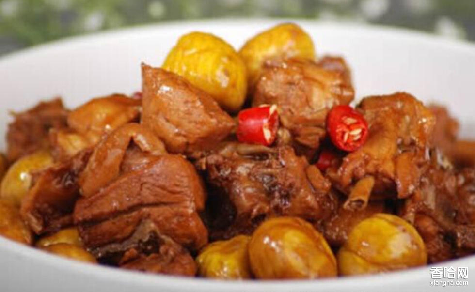 做法:1. 將仔母雞洗凈,頭、爪劈成兩半,胸翅部位切成6 塊,其它部位切成3 厘米見方的塊,雞腿剁成兩段,雞項剁成4 厘米的段,雞腕破成4 塊,剞小方格花紋2. 板栗在殼面上用刀砍成十字形,放入沸水鍋中用旺火煮5 分鐘,取出脫殼3. 炒鍋置旺火上,倒入植物油燒至七成熱,放入雞塊炸5 分鐘撈起4. 倒出鍋中油,加雞湯600毫升、板栗、醬油、精鹽、白糖、雞肫、雞肝、雞塊用旺火燒10 分鐘,至肉塊松爽,板栗粉糯時,加熟豬油、味精、蔥白段、用濕淀粉勾芡,起鍋裝盤即成。