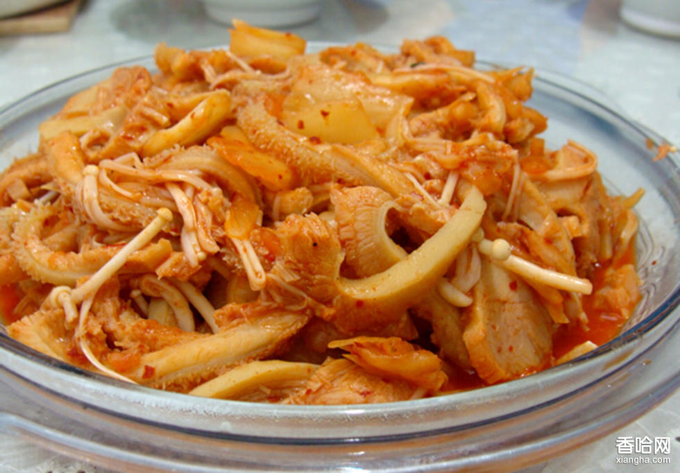 1、牛肚清理干凈;2、牛肚切絲,金針菇、泡菜備用;3、鍋中放入適量油,將牛肚倒下去煸炒,同時放入姜片、料酒、清水;4、加入泡菜;