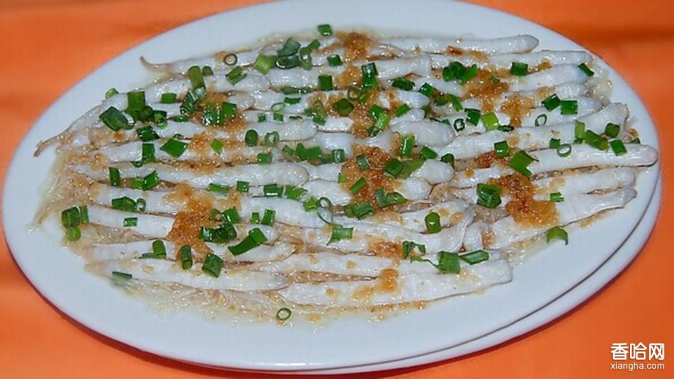 形狀很象蚯蚓,據(jù)稱是以吃沙維持生長的海洋生物。廣東人喜歡用曬干的沙蟲煲湯,說有滋補(bǔ)功效,功效如何未曾考究,但湯色乳白如牛奶,味道是相當(dāng)?shù)孽r甜。在湛江有新鮮的沙蟲出售,用粉絲清蒸沙蟲,有是另一種的鮮甜。敢吃蟲子的可以一試。