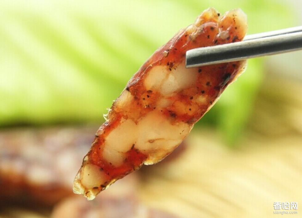 系以當(dāng)?shù)丶爸榻侵抟粠У孽r鴨肝腸為原料,要求含水分少,以當(dāng)日收購(gòu)當(dāng)日加工為宜。另選豬肥脊肉臘制上棚,10幾天左右,取下缸兩天,達(dá)到香味醇厚時(shí),取出切粒備用。腸衣百刮百曬,務(wù)求爽脆松化。調(diào)味品則用陳皮、酒、肉桂、糖、醬等。將鴨肝、臘豬肉及調(diào)味輔料拌和后填入腸衣,掛棚內(nèi)風(fēng)干兩日,用禾草間隔,入埕數(shù)日,既為成品。具有爽、香、滑的特點(diǎn)。