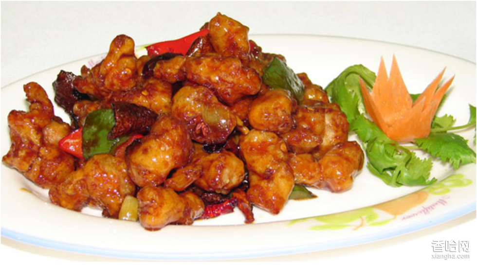 a)嫩雞開(kāi)膛洗凈后,去掉頭、頸、腳爪,剔去骨頭,雞肉切成約2厘米見(jiàn)方的塊,盛入碗,加姜、蔥、料酒、鹽、醬油拌勻;