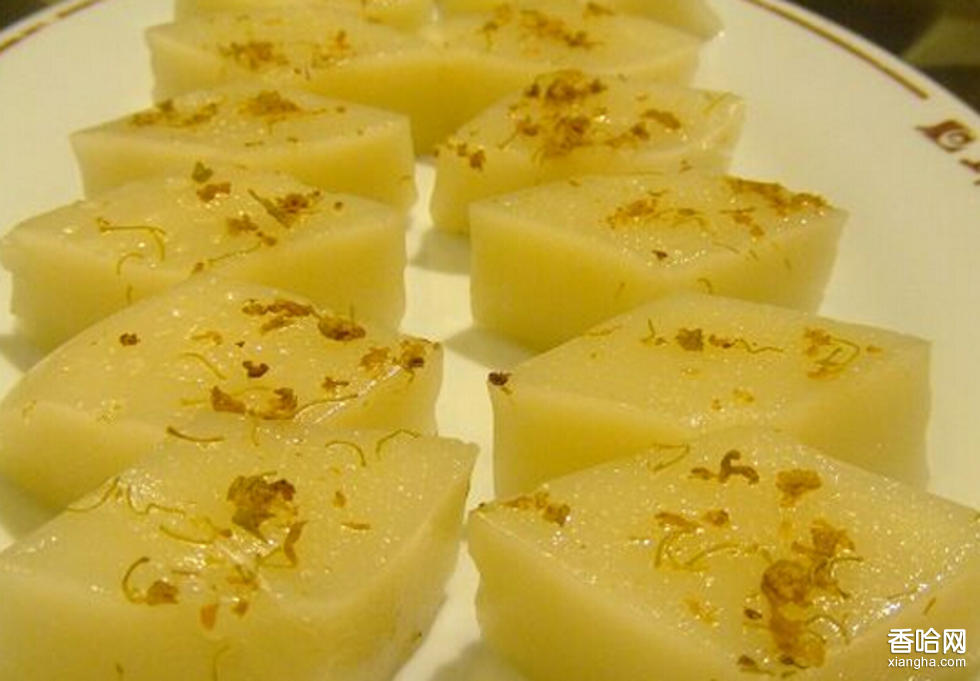 制作方法1.先將糯、粳米粉篩一下,加白砂糖,用清水揉拌均勻。2.將拌揉透的糕粉上籠蒸約一刻鐘。 然后將糕粉用濕紗布包住,不斷翻撳,揉捏,直至肯面光滑, 糕粉細(xì)膩為止。3.再將糕粉撳平,拉成長條,抹上植物油,撒上曬干后的桂花,切成長方塊即成。