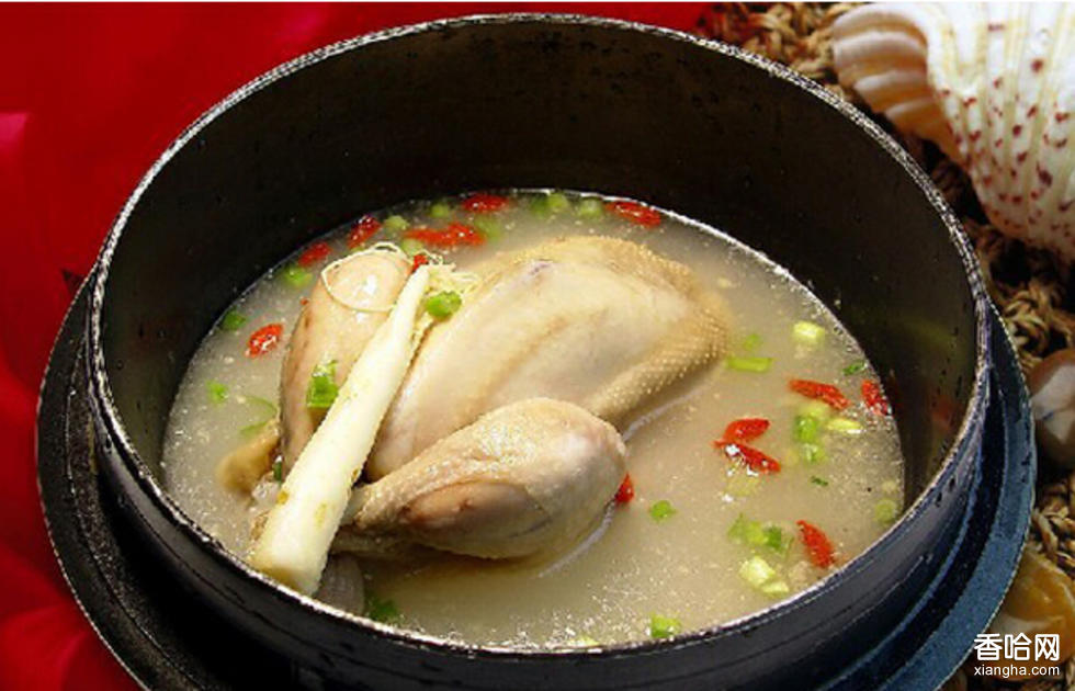 取1.25公斤土雞一只宰殺、去毛。開膛、去內(nèi)臟、洗凈。全雞放入高壓鍋中,加精鹽、料酒、姜片,添上清水少許,置于旺火之上高壓透氣后,再置文火和上閉氣清燉80分鐘,冷卻后起鍋和湯盛入湯盆內(nèi),再放入本地特制的苕線粉上火,待其滾沸飄香,油湯泛黃后,調(diào)味即可食用。這樣制作出來的賀勝雞湯色黃、味醇、湯鮮、肉嫩,肥而不膩,爛而不散,營養(yǎng)價值極高,最適宜老人、兒童、孕婦和病后滋補(bǔ),有壯陽、補(bǔ)血、利脾、健身之效。
