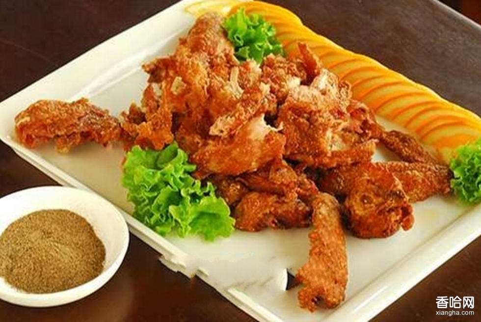 香酥雞,是崇陽新創(chuàng)的風(fēng)味名菜之一。制作方法是:將宰好的嫩母雞,用刀背把翅膀和大腿骨砸斷,使骨斷肉連,將少許精鹽、醬油、味精、色酒混合一起,揉抹在雞身上,將蔥白、姜塊、五香料塞進(jìn)雞腹中,腌3-4小時后,上籠蒸爛,揀出雞內(nèi)各種佐料,涼干水分,再將雞抹上蛋清糊,放入油鍋炸成金黃色,然后用刀剁成大塊,擺入盤內(nèi)即成。此菜顏色金黃,皮爛酥,肉香醇味美,食而不膩。