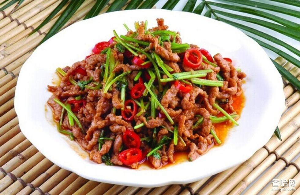 4、牛肉洗凈剁碎,以鹽、糖、生粉、姜絲、頭菜、美極醬油、陳皮碎、花生油拌勻,鋪在秋茄上,入蒸爐蒸10分鐘,取出撒上蔥花便成。