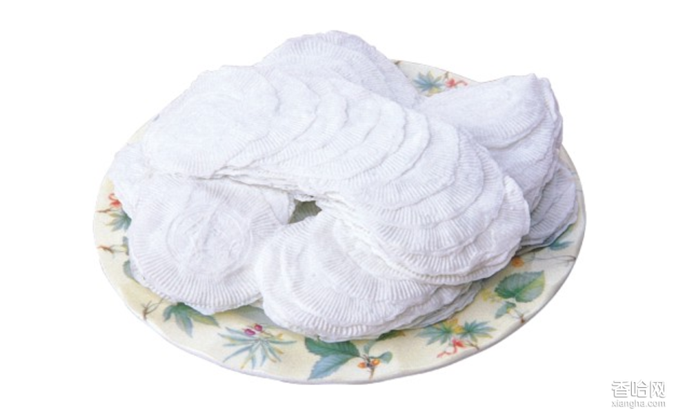 為雪白圓狀薄片,味略咸而甘甜可口,正氣補(bǔ)身,有墜火功效,可佐粥下飯。