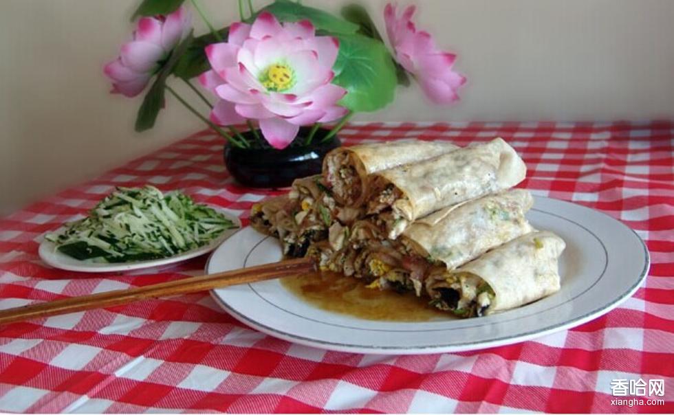 制作時,先用水將面粉和成軟如糖稀的面團,再以150克重的軟面做成兩個大小相近的小餅,摞在一起,然后放在鏊子上,將兩面烙成黃色麻花狀,待中間凸起時,迅速取出置于蓋有棉墊的容器中備用,制餡時一般每500克餅用豆腐400克,熟豬頭肉150克,雞蛋3個,香油75克,鹽5克,芫荽末少許。最后將每次烙好的雙層餅揭開,成為兩張薄單餅,以烙面為里在鍋內稍煎。切成兩段后即可裝盤食用,呈蛋黃色,餅美味香。