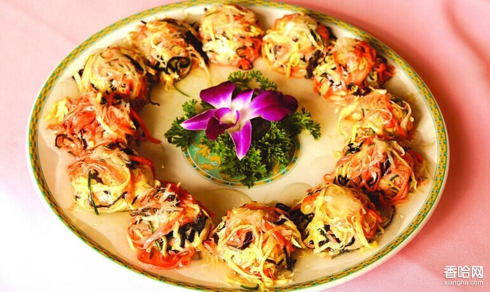 此菜形象逼真,有如舞龍時用的繡球,色彩鮮艷,絢麗多彩,故而得名。形似繡球,口感嫩爽多汁,鮮而不膩,甘美滑潤。