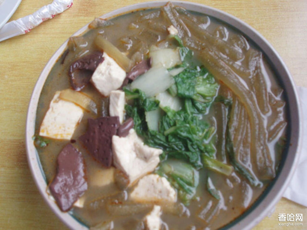 扁粉菜的制作原料和工藝都很簡單,大多是以大鍋菜、扁粉條為主要原料。首先熬一大鍋的高湯,將扁粉條下鍋煮熟,再燴入豆腐片,豬血片和青菜。