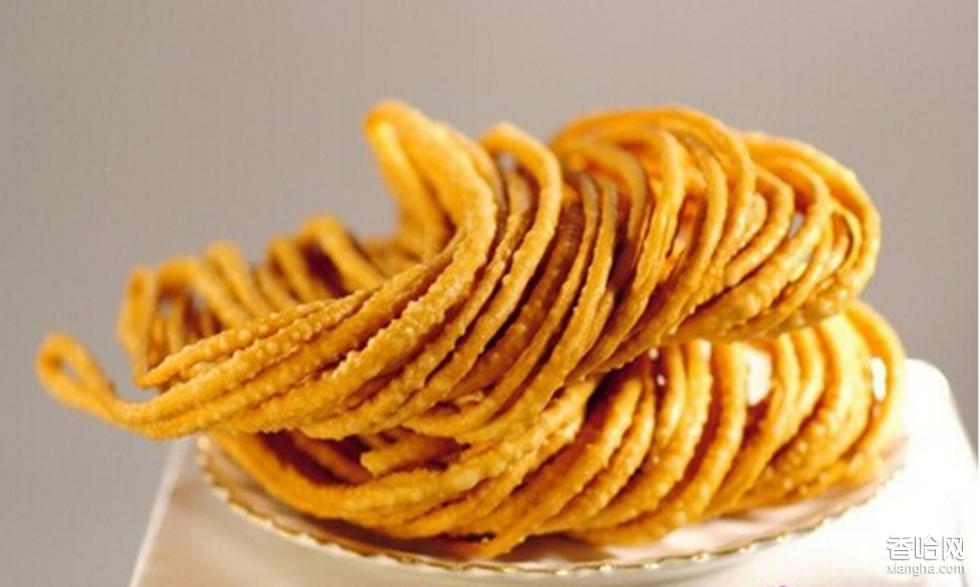 制作方法:1.制水調面團:把鹽用水充分溶解后,加入面粉拌和,然后將面團充分搗制,一般不少于20分鐘,使面團具有良好的韌性。不調韌性面團制成后把它平攤在操作臺上,由邊緣逐步向中心劃開。用雙手把劃開的面團粗條在操作臺上揉搓成5毫米直徑的細長圓條,邊揉搓邊逐層盤入放有花生油的磁盆內(每層之間必須涂油,防止粘條),條盤放好后必須放置2小時后才可繞條炸制。2.繞條炸制:待盤條回餳后,以右手執(zhí)條邊拉邊繞排列左手四指上,繞時左手四指伸直,用大拇指按住條頭,繞7~8圈,再以右手伸入條圈中,兩手四指并攏抻拉面條,使繞條延伸至原長2倍,再騰出右手用2支筷子叉住左手上的繞條繃緊,然后雙手各執(zhí)1支筷子放入油鍋炸制,油溫一般在220℃左右。入鍋片刻用筷將繞條疊制成扇狀,再取下竹筷。也可以使1支筷子翻轉180°繞成長卷狀。還可以用不同手法制成梳型、花朵型、帚型等。油馓成型后要在油鍋內翻動,使色澤均勻一致。待炸至金黃色出鍋瀝油。
