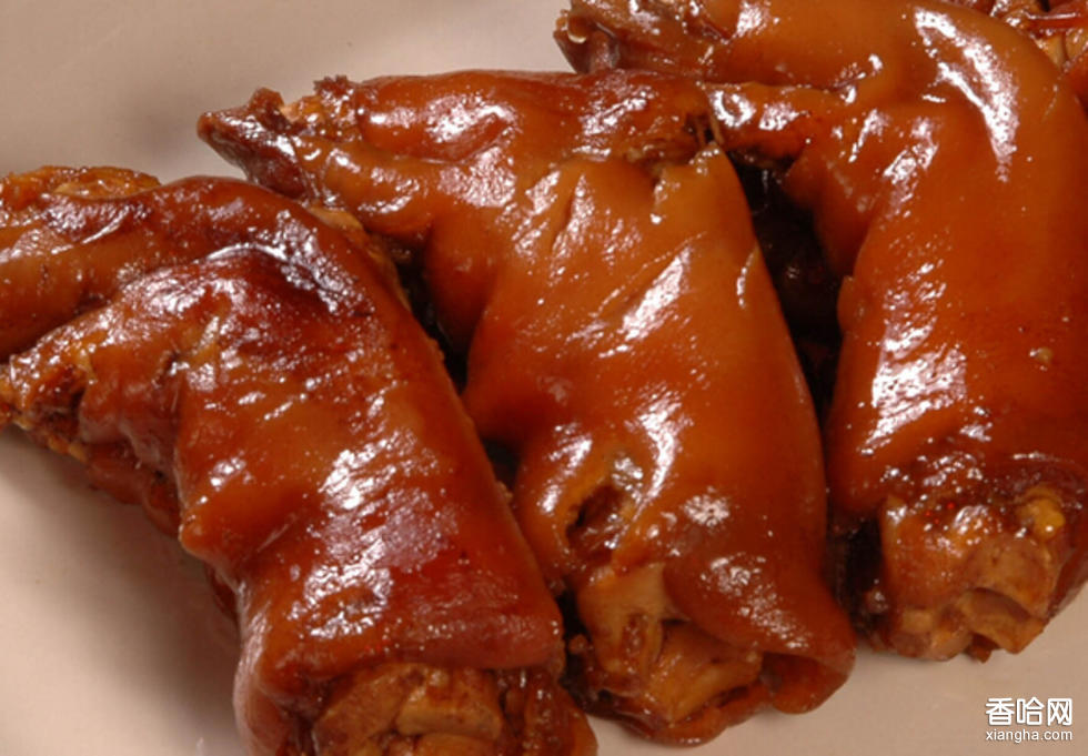方法:1、豬前蹄一只,蹄膀去骨用棉線扎緊,和豬爪子一起放入清水中,煮至沸,一是定定型,一是去血水.第一鍋水倒掉;2、洗干凈鍋,加少許水并50克白糖,炒至糖化開,小火再炒,一直到糖色呈黃色.此時加入適量的水、鹽、醬油,放入"五香",放入豬蹄.待水沸后再用中小火煮1小時左右就可以了;3、這是剛鹵好的,很軟和,別著急吃.要放涼,最好是放在冰箱里,涼了才會皮Q肉香;4、成品切一盤。