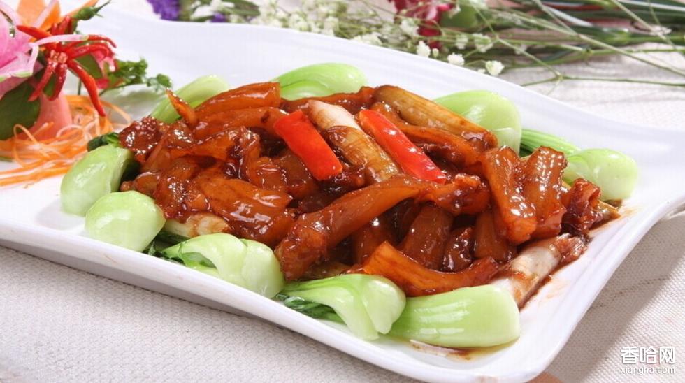 蔥燒蹄筋,典型的傳統(tǒng)魯菜,有了章丘大蔥的配料,使主料的鮮嫩軟滑揉進了濃濃的大蔥的香甜。